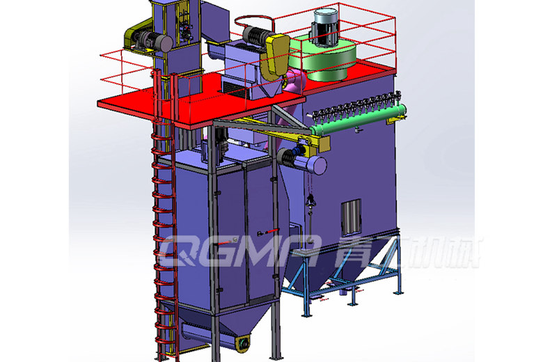 青工吊鉤式拋丸機拋丸作業時,拋丸器拋射出來的鋼丸掉落到拋丸室底部,由螺旋推料器輸送至提升機底部,再由提升機皮帶總成將鋼丸提升至頂部的分選器中,對回收的鋼丸進行篩分作業。 目的是將拋丸過程中破碎的鋼丸及粉塵分離出來。通過分選器,合格的鋼丸將直接進入拋丸器上方的儲料倉內,準備再次利用。碎鋼丸將被分離出來,通過旁路砂管掉入廢料筒中;粉塵則被吸入除塵器內,在正常操作下,含塵的空氣進入除塵器,然后向下經導流板分散后通過濾芯,粉塵即被阻擋在濾芯外表面上,過濾后的清潔空氣經濾芯中心進入清潔空氣室,通過出口排出。 本機型廣泛應用于齒輪、齒軸、鍛造、鑄造、建筑、化工、電機、機床等行業的中、小型鑄、鍛件的表面清理或強化處理,如除氧化皮、毛刺、砂鑄件除砂等。 并且本機型適合于不宜碰撞的細長、薄壁件的清理。 吊鉤式拋丸機作為拋丸清理機的標準機型,其拋丸室旋轉直徑從1000到3000 mm, 高度從1200 到3000 mm. 標準機型帶有2-7個拋頭,承載量達10000公斤,這款拋丸機的生產效率相當高,靈活性跨度也相當大,是理想的清理強化設備,并且操作簡便,只需將要處理的工件裝載上機器,按下啟動按鈕,經過一個很短的時間(一般為5-7分鐘),即完成了整個清理過程,清除掉所有粉塵和殘余丸料,主要適用于各種中、大型鑄件、鍛件、焊件、熱處理件的表面處理,包括易碎和形狀不規則的工件。
